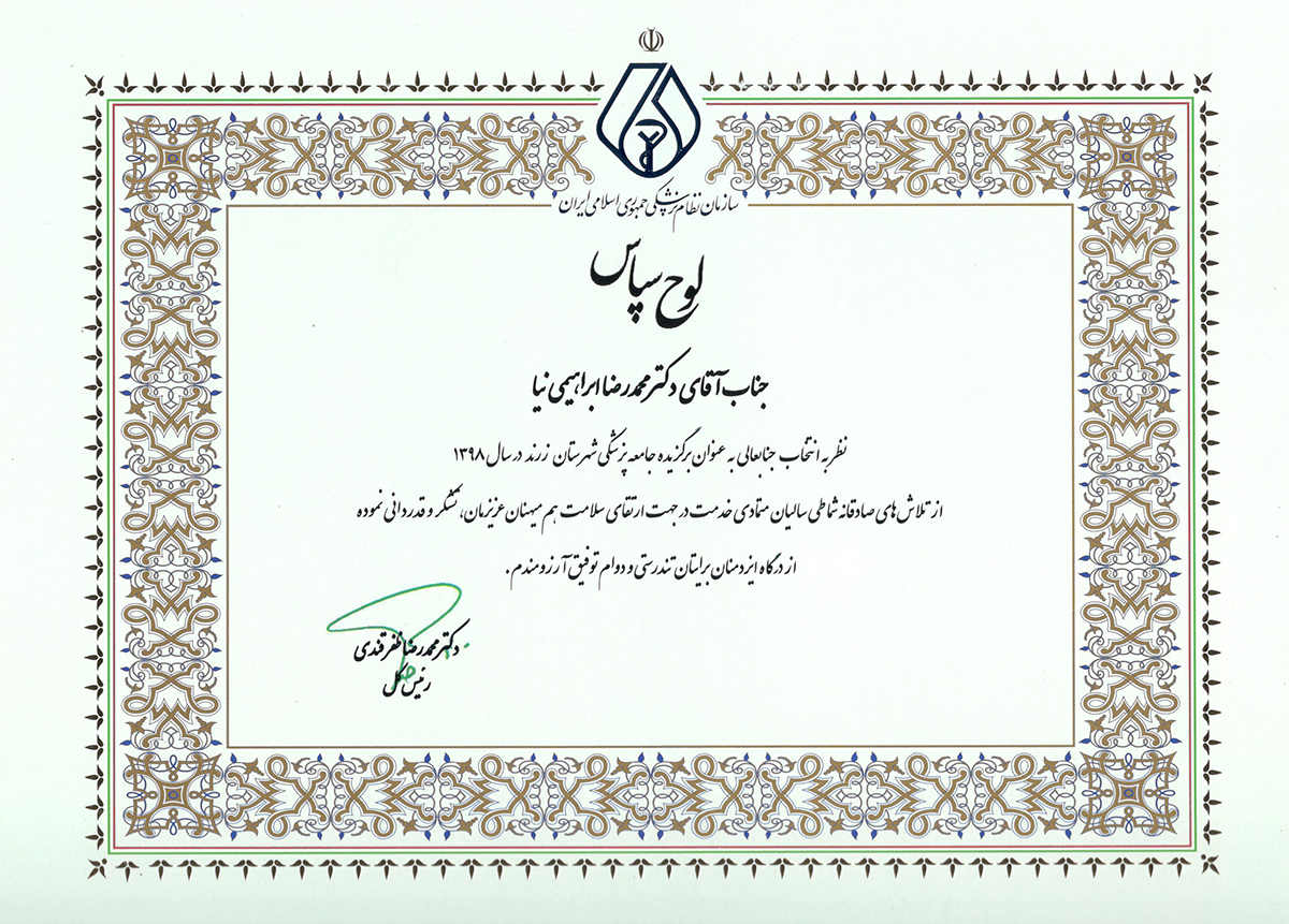 دکتر ابراهیمینیا به دلیل تعهد و دقت بالای خود در درمان بیماران، بارها مورد تقدیر قرار گرفته و موفق به دریافت تقدیرنامه به عنوان برگزیده ی جامعه ی پزشکی شدهاند. ایشان با ارائه خدمات درمانی ممتاز و ایجاد رابطهای انسانی و دلسوزانه با بیماران، توانستهاند اعتماد بسیاری از افراد را جلب کنند.