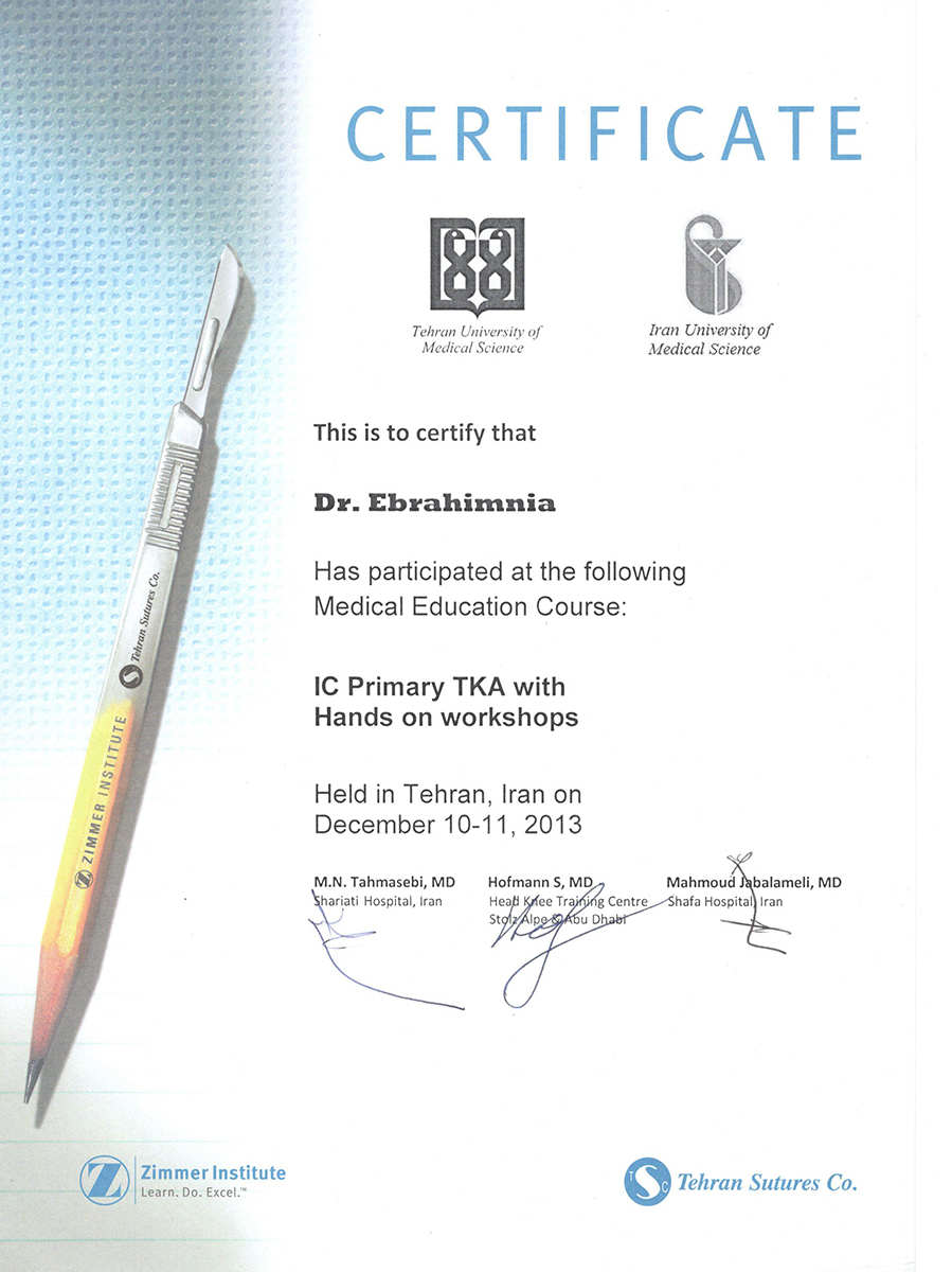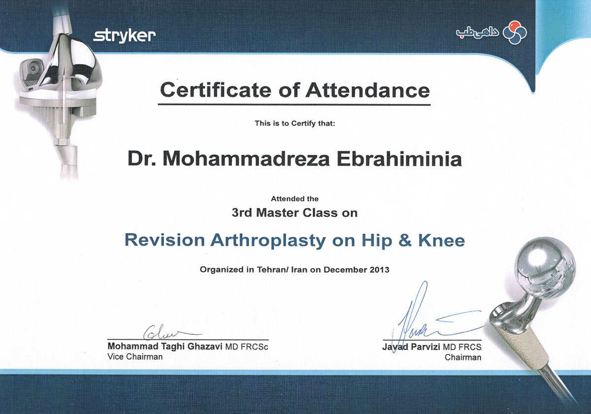 دکتر ابراهیمینیا با حضور در دورهها و مسترکلاسهای تخصصی برگزار شده در داخل کشور، بهویژه در حوزه جراحی آرتروسکوپی زانو، همواره مهارتهای خود را در جراحیهای نوین و تکنیکهای پیشرفته بهروزرسانی کردهاند. این مسترکلاسها توسط برجستهترین اساتید داخلی برگزار شده و تجربه و دانش دکتر ابراهیمینیا را در مواجهه با موارد پیچیدهتر به طرز چشمگیری افزایش داده است.